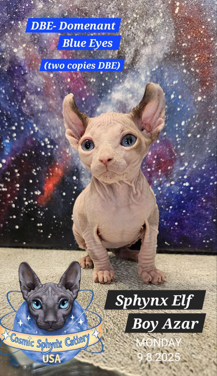 Meet our extraordinary boy Azar He is truly a rare and unique Sphynx Elf kitten with incredibly deep and mesmerizing blue eyes (DBE โ€“ Dominant Blue Eyes) that capture your heart from the very first glance. ๐Ÿ’™ Azar has an amazing personality โ€” he is affectionate, very friendly, active, purring, and loves to give kisses and cuddles. He wants to spend all his time in your arms, making him the perfect lifelong companion. ๐Ÿพ Azar has already had his veterinary exam, he is healthy, vaccinated twice, dewormed twice, and comes with full TICA paperwork. He is ready to go home today! ๐Ÿก ๐Ÿ“ฉ Text me at 815-616-4282 for more information or to reserve Azar. ๐ŸŒ You can also find all the details on our Facebook page Cosmic Sphynx