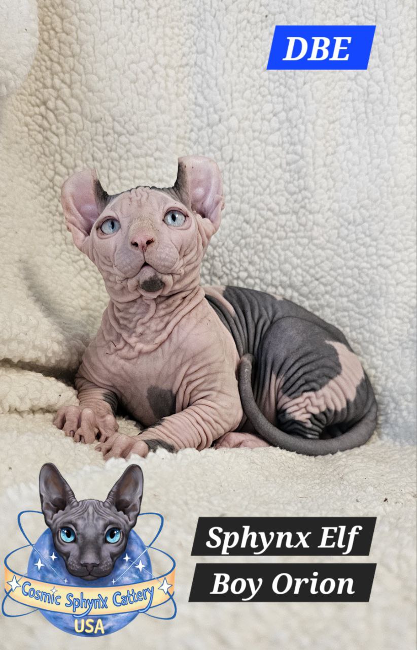 Meet the new superstar โ€” Orion โœจ If a cat could be a model, he would look exactly like this! Meet our stunning Sphynx Elf boy Orion, with his breathtaking sky-blue eyes (DBE โ€“ Dominant Blue Eyes). ๐Ÿ’Ž Another rare and unique treasure from Cosmic Sphynx Cattery, Orion is extraordinary in every way โ€” from his mesmerizing eyes and perfectly built elegant body, to his rare and exceptional personality. He is not only handsome โ€” he is truly one of a kind. Orion has the grace and presence worthy of a royal family. ๐Ÿ‘‘ ๐Ÿ“ฉ Message us today to learn more about this rare gem.